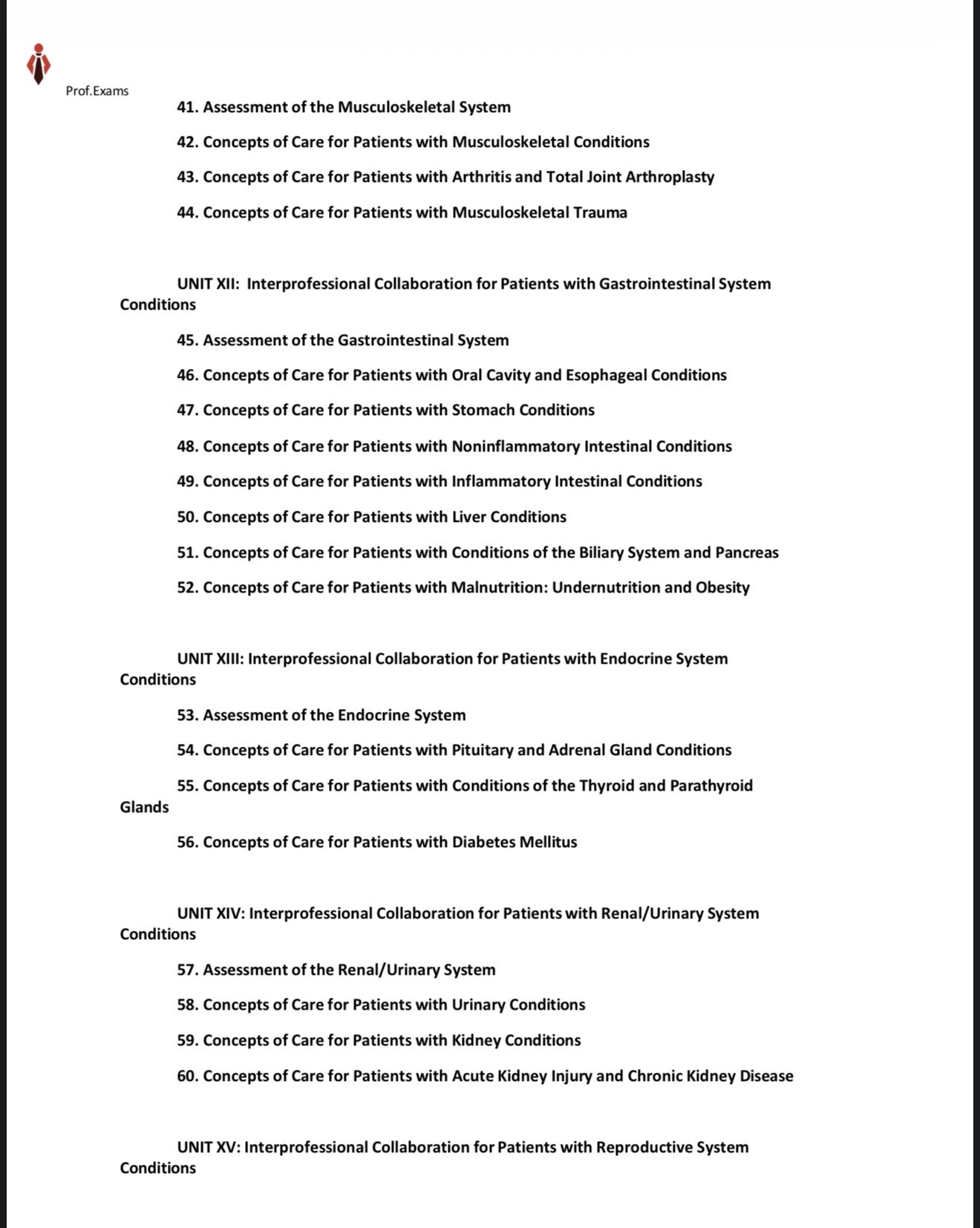 It provides an extensive set of exam-style questions focused on clinical judgment, patient management, and interprofessional collaboration in nursing care.